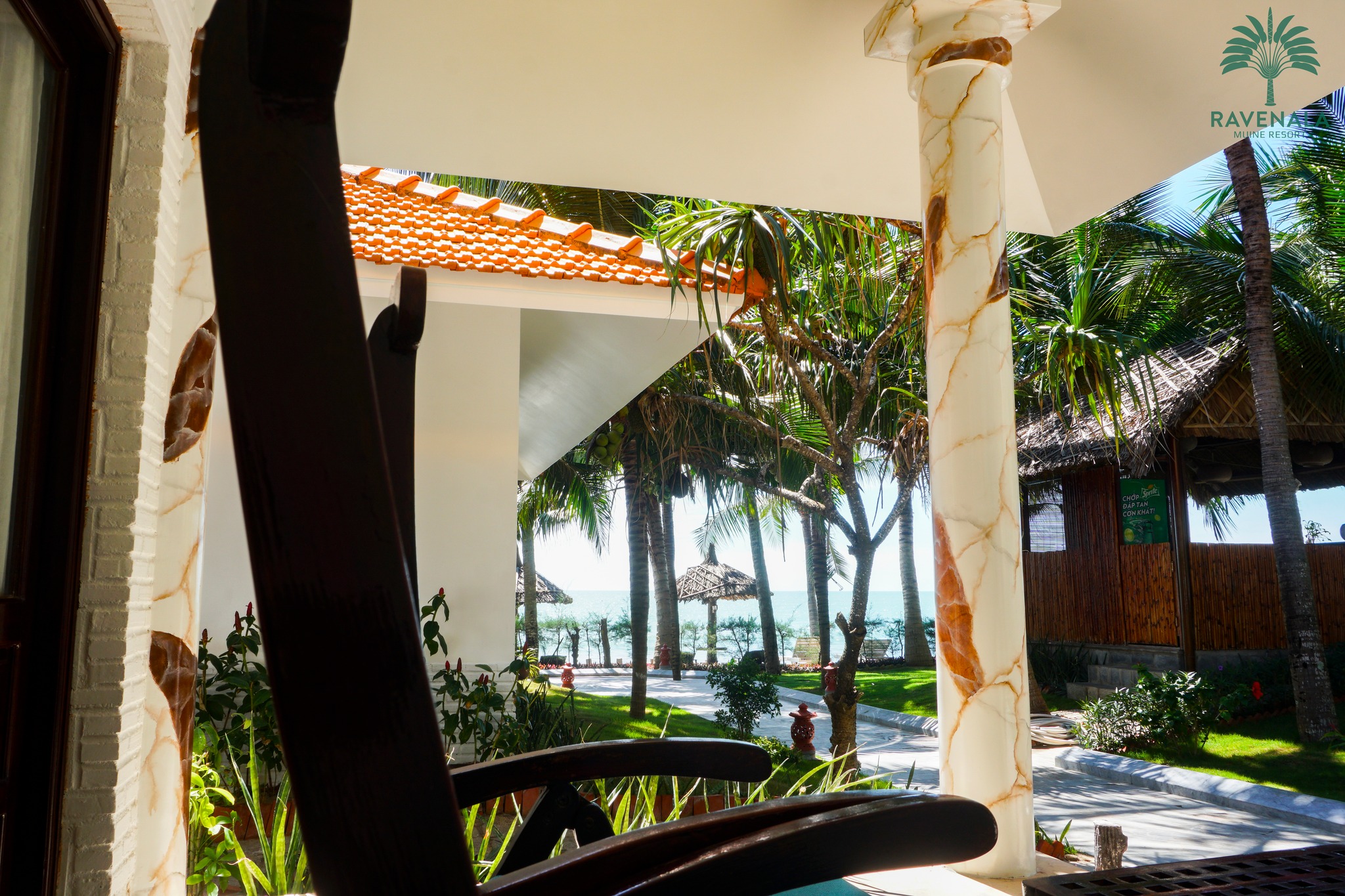 + Ravenala được chăm chút với những mảng xanh tươi mát khiến cho mỗi một góc vườn đều đáng để bạn ngắm nhìn thư giãn. Đặc biệt những hàng dừa cao vút như một điểm nhấn mà khi bạn thả mình trong làn nước mát của hồ bơi tràn có thể nhìn lên các rặng dừa cao ngút tầm mắt in bóng trên nền trời xanh thật đẹp xao xuyến lòng người.