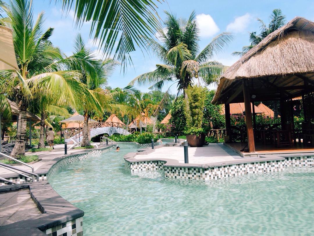 Nổi bật giữa không gian khoáng đạt là hồ bơi trung tâm rộng hơn 600m2 có tầm nhìn hướng biển. Bên cạnh việc mang đến cho du khách thời gian thư giãn thoải mái trong làn nước xanh mát, đây còn là điểm thích hợp cho những bữa tiệc hồ bơi về đêm lãng mạn. Nơi này cũng cung cấp những tiện ích phù hợp với nhiều đối tượng khách khác nhau, kể cả nhóm khách gia đình đa thế hệ.