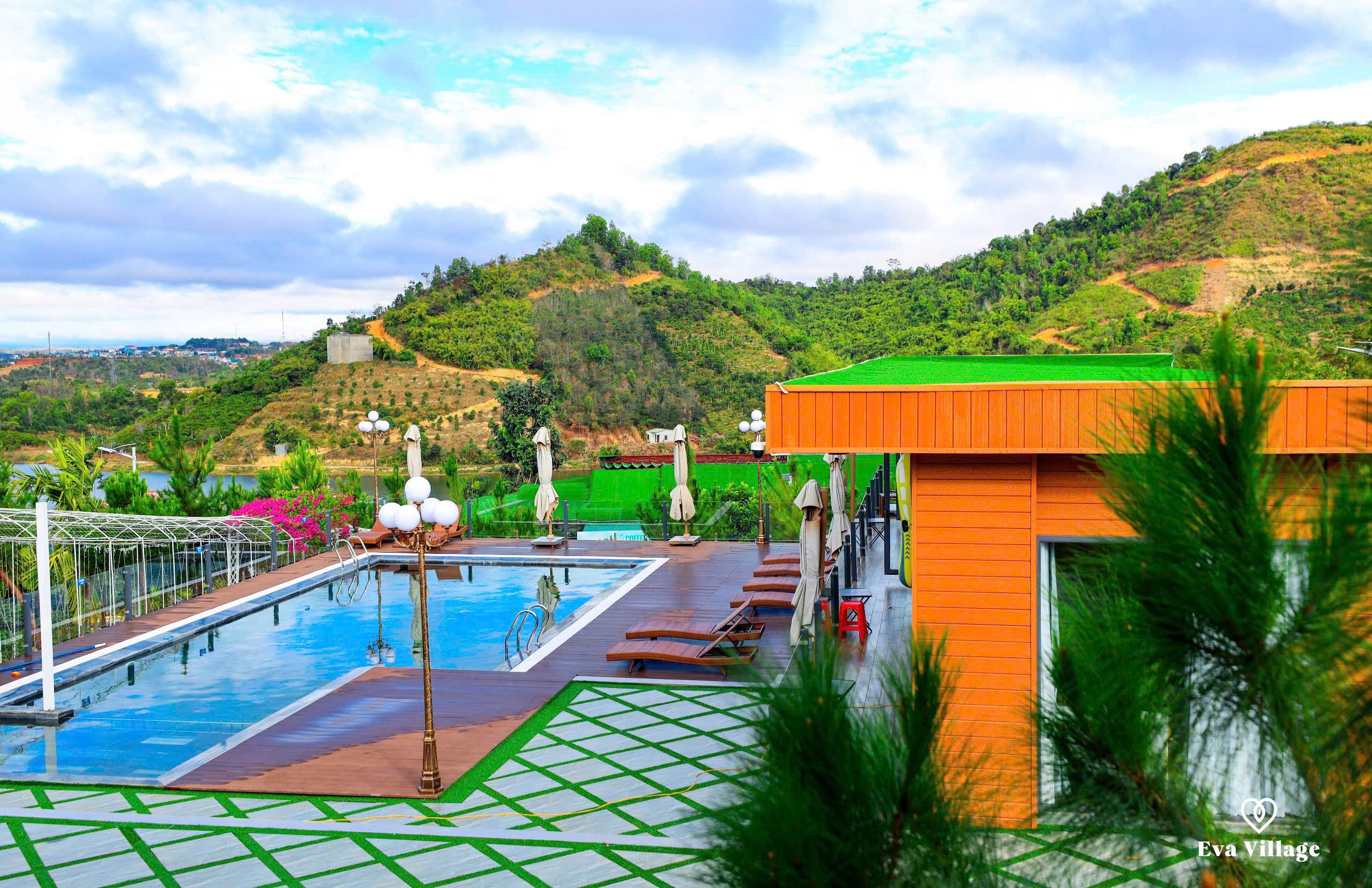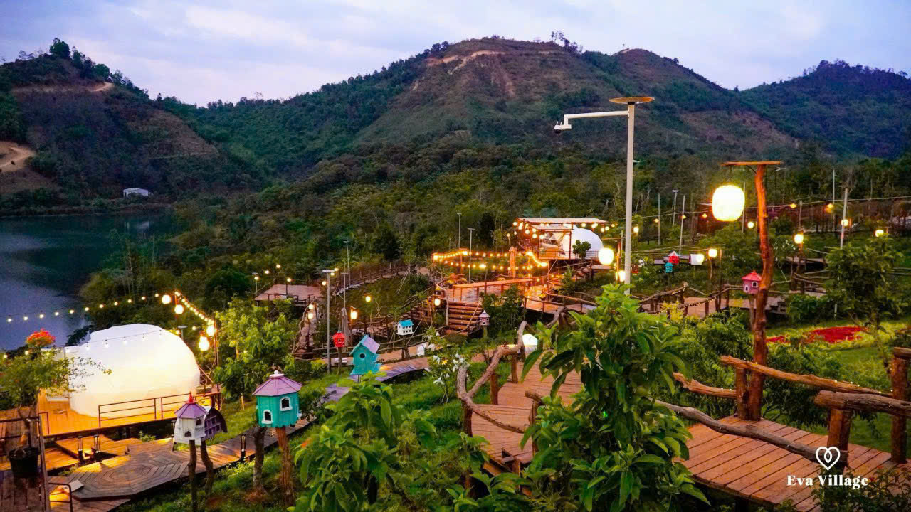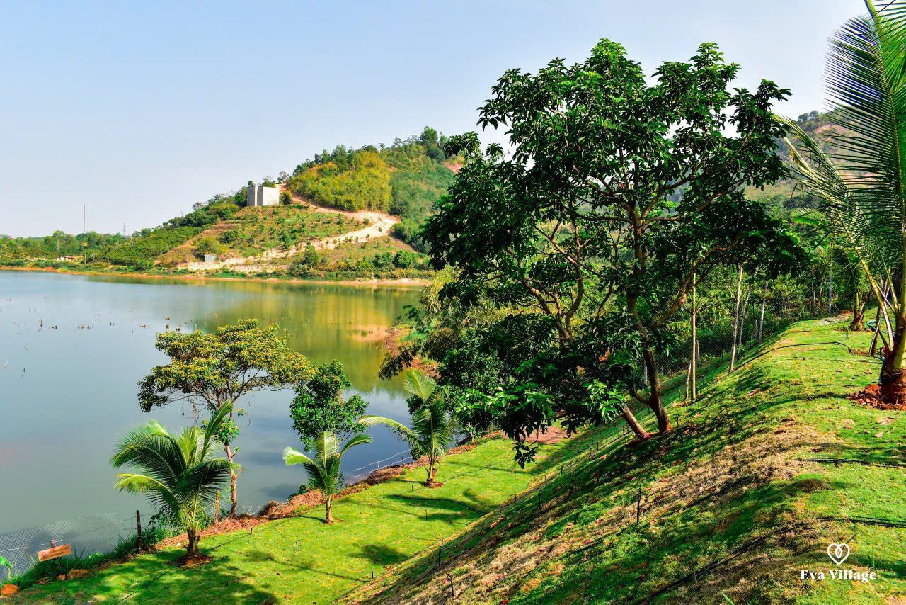 Tạm gác lại những ồn ào náo nhiệt của phố thị, để tâm hồn được thanh lọc và cơ thể được tái tạo tại EVA VILLAGE. Tọa lạc bên bờ hồ thơ mộng, với khung cảnh thiên nhiên hùng vĩ, EVA VILLAGE mang đến cho du khách một không gian nghỉ dưỡng hoàn hảo, tách biệt khỏi sự xô bồ của cuộc sống thường nhật. Nơi đây, bạn sẽ được đánh thức bởi tiếng chim hót líu lo, tiếng gió reo qua tán cây, và đắm chìm trong khung cảnh bình minh và hoàng hôn rực rỡ tựa như những bức tranh nghệ thuật.