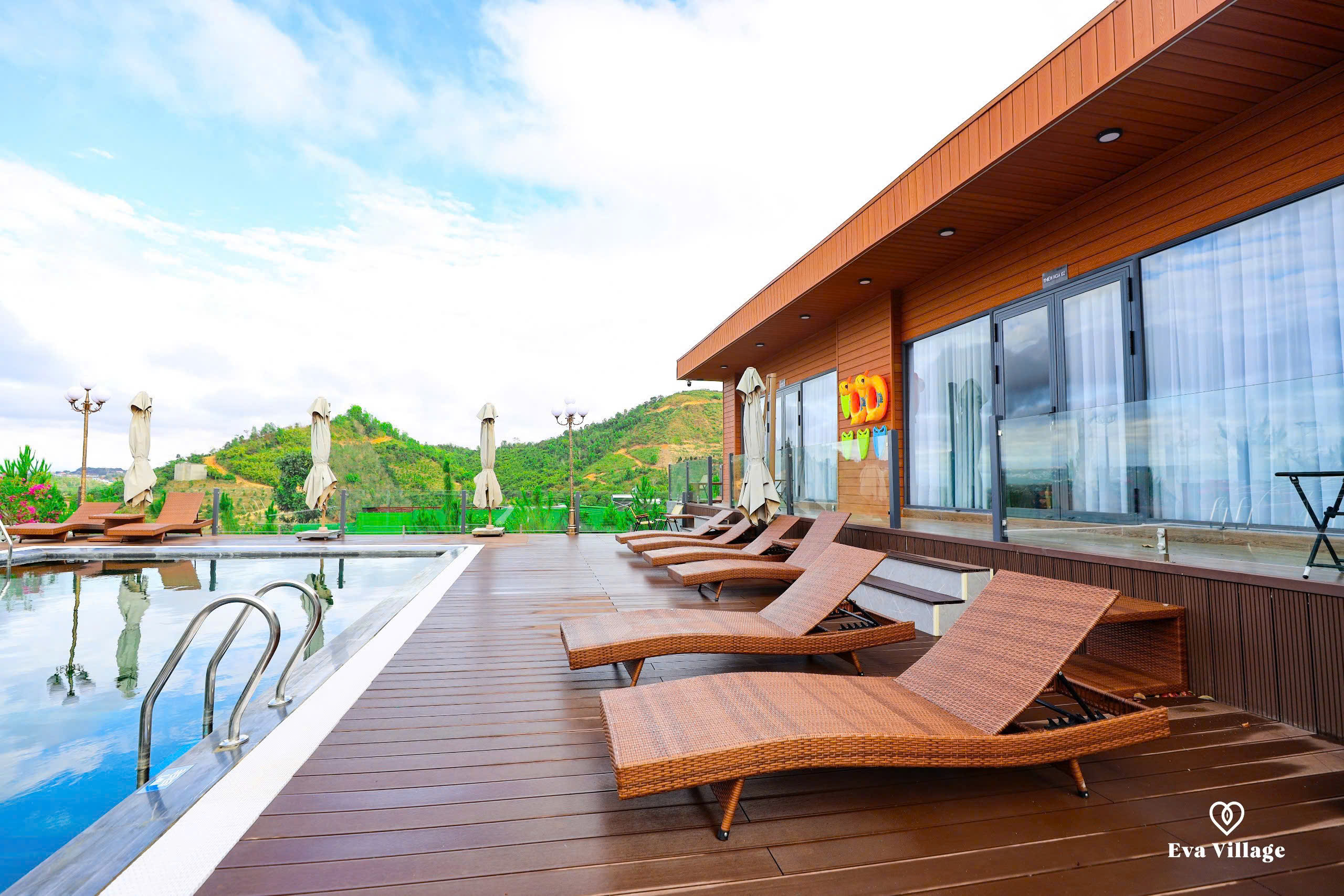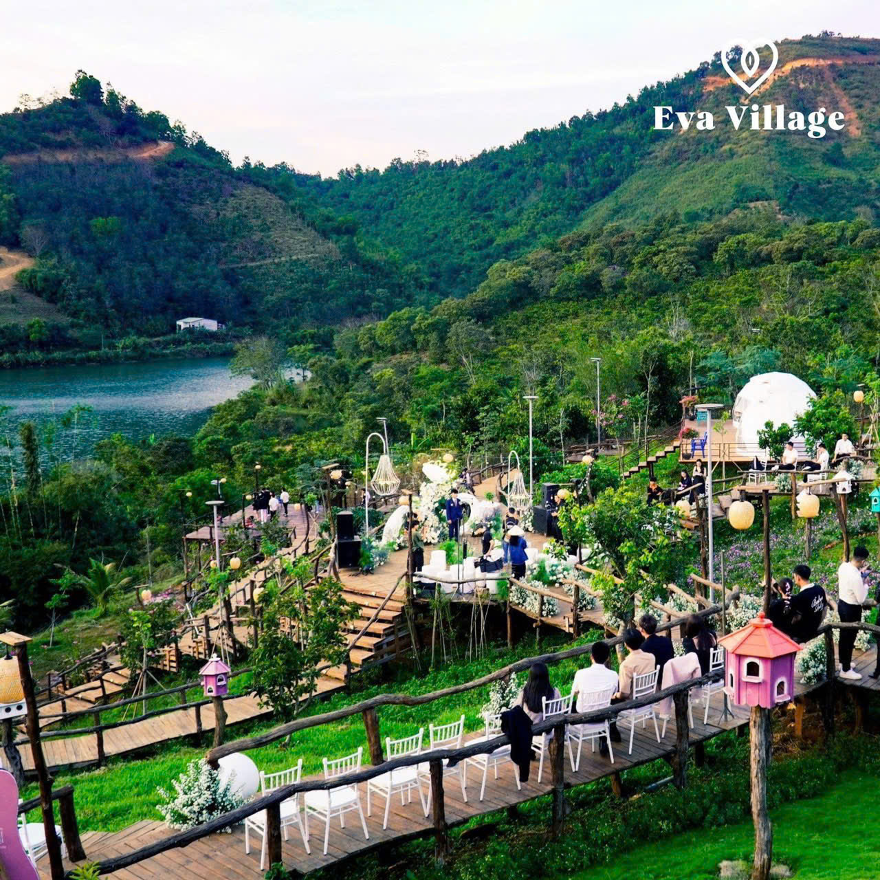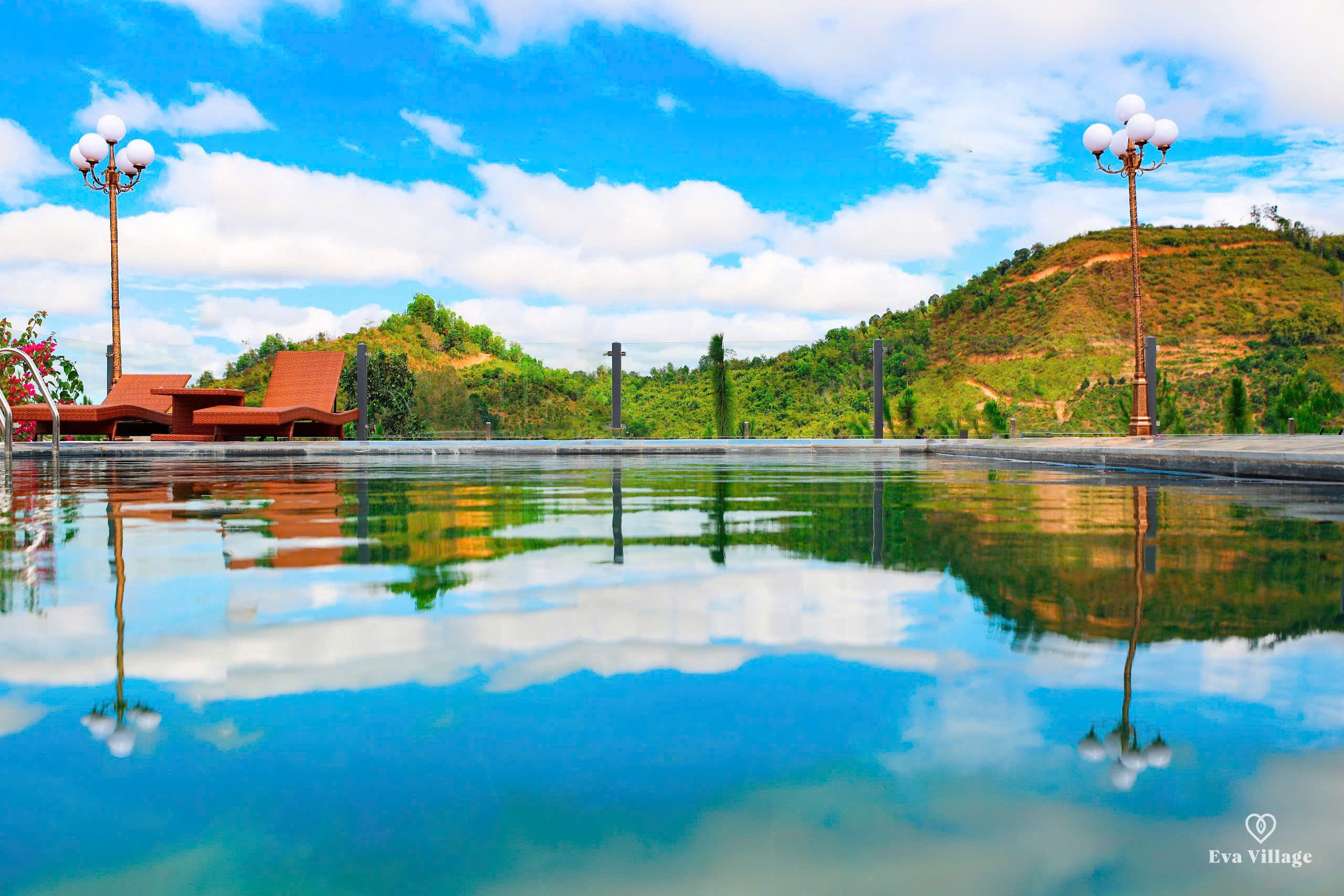 Tạm gác lại những ồn ào náo nhiệt của phố thị, để tâm hồn được thanh lọc và cơ thể được tái tạo tại EVA VILLAGE. Tọa lạc bên bờ hồ thơ mộng, với khung cảnh thiên nhiên hùng vĩ, EVA VILLAGE mang đến cho du khách một không gian nghỉ dưỡng hoàn hảo, tách biệt khỏi sự xô bồ của cuộc sống thường nhật. Nơi đây, bạn sẽ được đánh thức bởi tiếng chim hót líu lo, tiếng gió reo qua tán cây, và đắm chìm trong khung cảnh bình minh và hoàng hôn rực rỡ tựa như những bức tranh nghệ thuật.