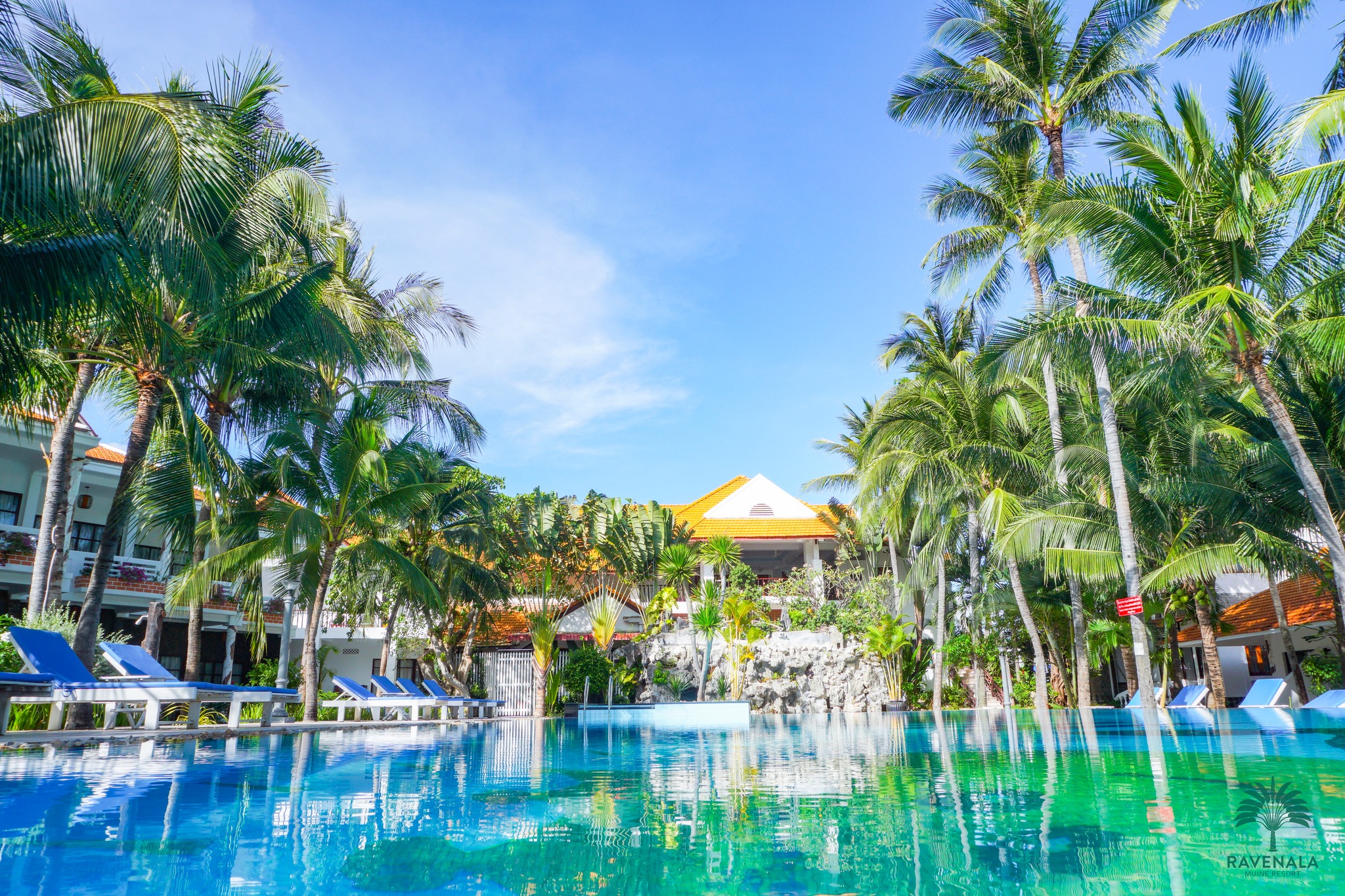 + Ravenala được chăm chút với những mảng xanh tươi mát khiến cho mỗi một góc vườn đều đáng để bạn ngắm nhìn thư giãn. Đặc biệt những hàng dừa cao vút như một điểm nhấn mà khi bạn thả mình trong làn nước mát của hồ bơi tràn có thể nhìn lên các rặng dừa cao ngút tầm mắt in bóng trên nền trời xanh thật đẹp xao xuyến lòng người.