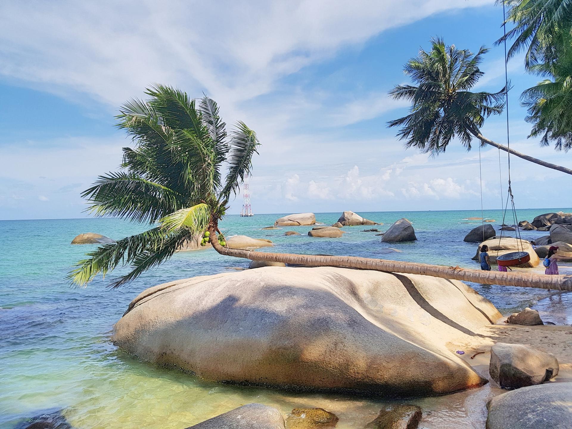 Bãi Cây Dừa Nghiêng được bao quanh bởi những ngọn đồi xanh tươi, tạo nên một khung cảnh thiên nhiên hoang sơ và hùng vĩ. Tại đây, du khách có thể tận hưởng không khí trong lành của biển cả.