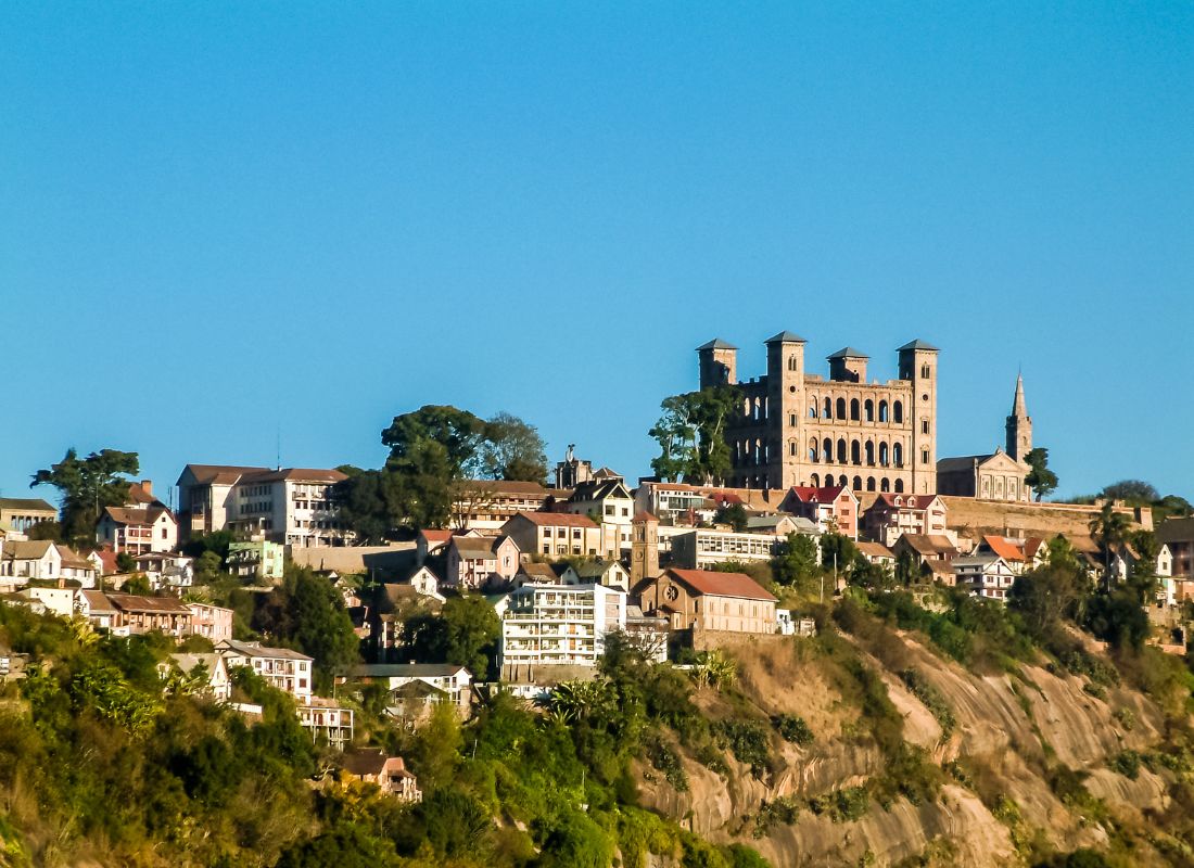 Dành buổi chiều tham quan Antananarivo. Thành phố nằm ở độ cao 1.280 m. Quý khách lên đồi Analamanga, nơi tọa lạc vương cung Rovan'i Manjakamiadana, hay thường được gọi là “Cung điện Nữ vương” do được xây cho nữ vương Ranavalona I vào năm 1841. Thật không may, cung điện đã bị một vụ hỏa hoạn đáng ngờ phá hủy nghiêm trọng vào năm 1995, nay chỉ còn lại cái vỏ bằng đá bên ngoài. Tuy nhiên, nơi đây cung cấp tầm nhìn tuyệt vời để ngắm nhìn toàn cảnh thành phố Antananarivo từ trên cao.