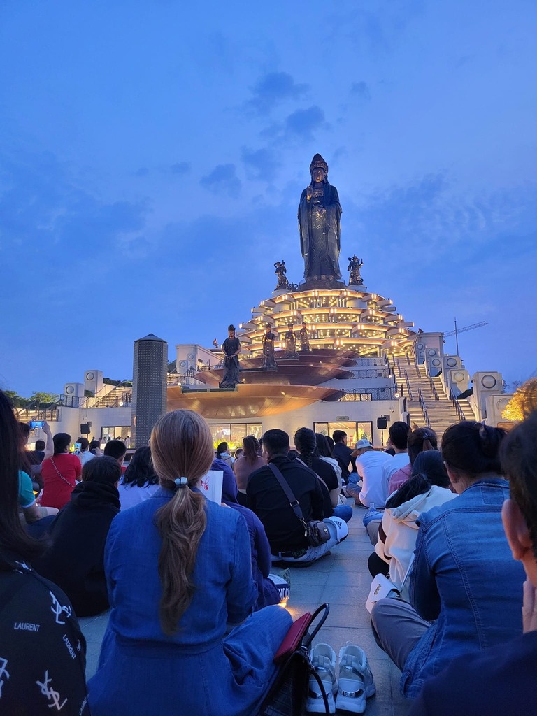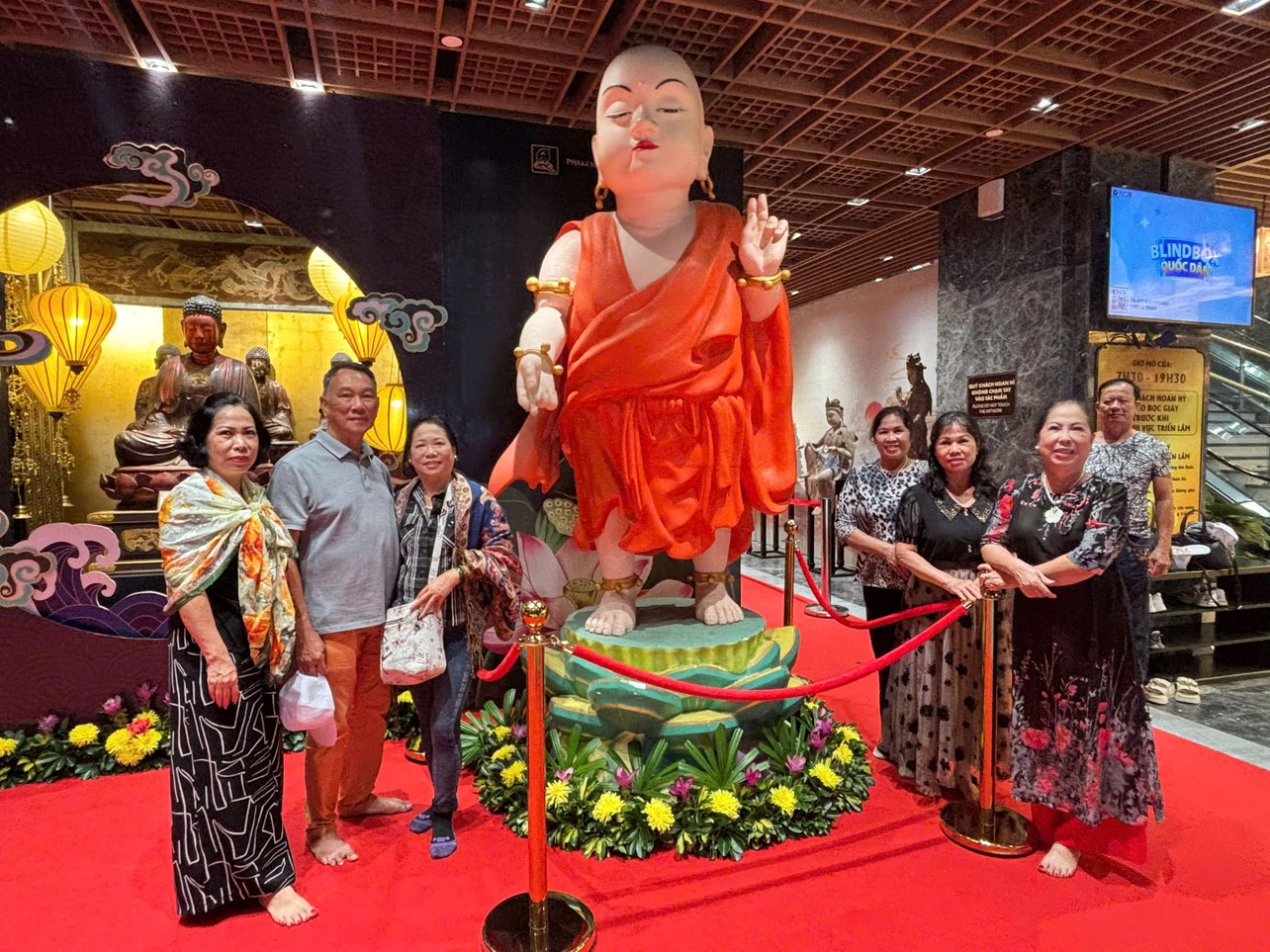 Đoàn thăm viếng khu trưng bày nghệ thuật Phật Giáo trong khung cảnh ban đêm lung linh tại đây. Dưới chân Tượng Phật Bà là khối đế cao 4 tầng với lối kiến trúc đồng tâm. Không gian nội thất sử dụng 3 loại đá: đá granite tự nhiên, đá trắng của Ý, đá nâu Tây Ban Nha tạo nên một không gian trang nghiêm mà bình an, tự tại.
